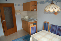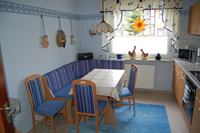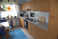 - und einer Wohnküche mit Eckbankgruppe und modern eingerichteter zweiteiliger Küchenzeile. In der Küche gibt es: Platz für 6 Personen (Ausziehtisch), eine Kühl/Gefrierkombination, eine Mikrowelle mit Grill, einen Umluftherd mit Ceranfeld, eine Edelstahlspüle, einen Wasserkocher, einen Eierkocher, einen Toas