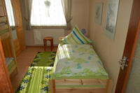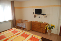 Auch die kleine Vorratskammer, in welcher der Kinderhochstuhl wartet, und der mit praktischer Garderobe ausgestattete Flur möchten erwähnt werden. Ein richtiges Kinderbettchen (kein Reisebett) kann nach Bedarf im Schlafzimmer aufgestellt werden. Ansonsten kann mit einem Handgriff für die größeren „Alleinschläferkinder“ ein Sicherheitsgeländer am Kinderzimmerbett nachgerüstet werden. Diverse Artikel wie Babyphon oder WC-Sitzverkleinerer sind vorhanden.